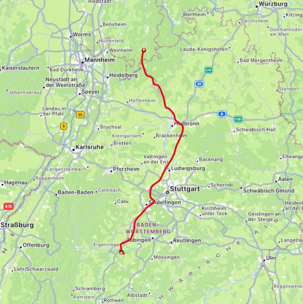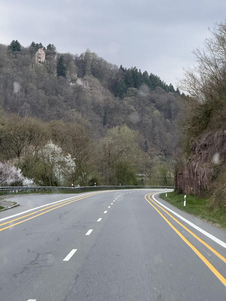Gegen 17 Uhr habe ich mich dann auf den Weg Richtung Frankfurt gemacht. Ab Neckarsulm gib es dann ein gutes Stück des Weges auf der Burgenstraße – schade, dass es ein wenig regnete.