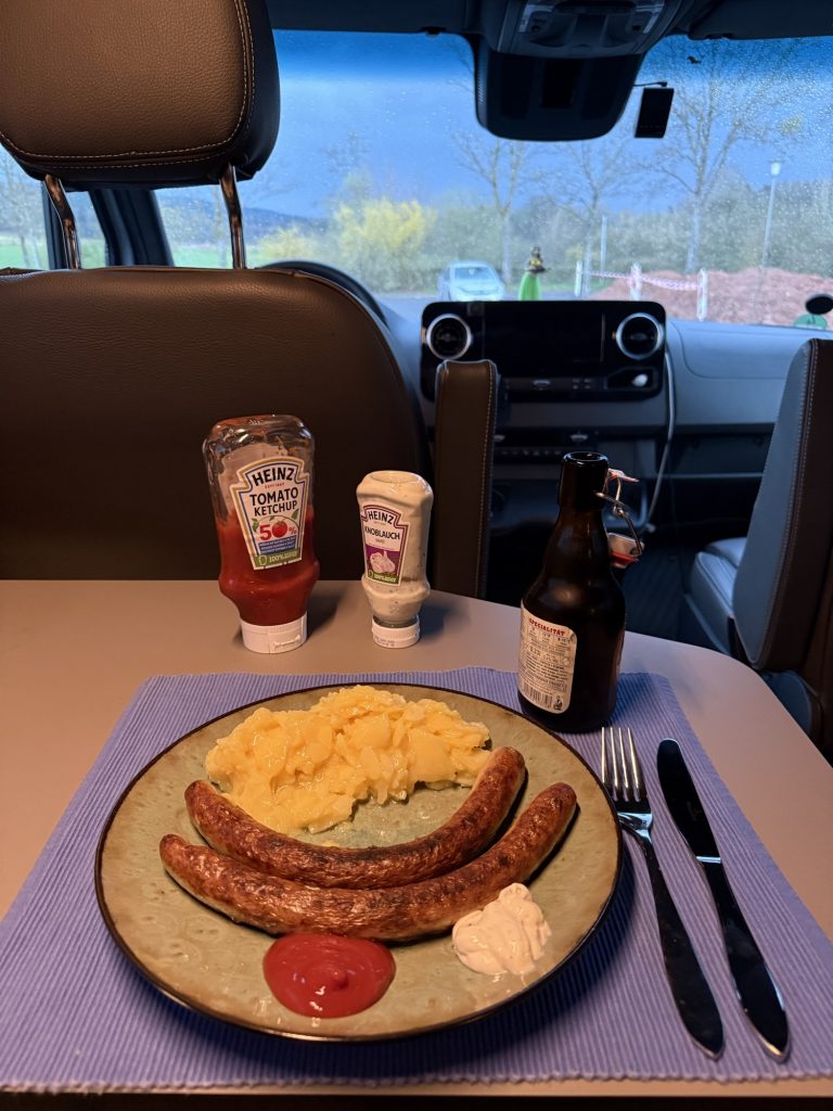 Gegen halb acht bin ich dann an meinem kostenlosen Übernachtungsplatz der Gemeinde Beerfelden angekommen. Da es regnete wurden die Thüringer heute nicht gegrillt, sondern schnell in der Pfanne angebraten – und vom Kartoffelsalat war auch noch was da – guten Appetit!