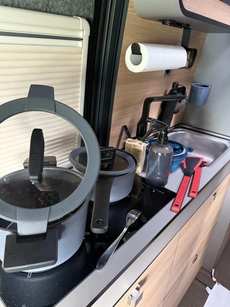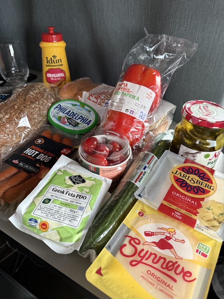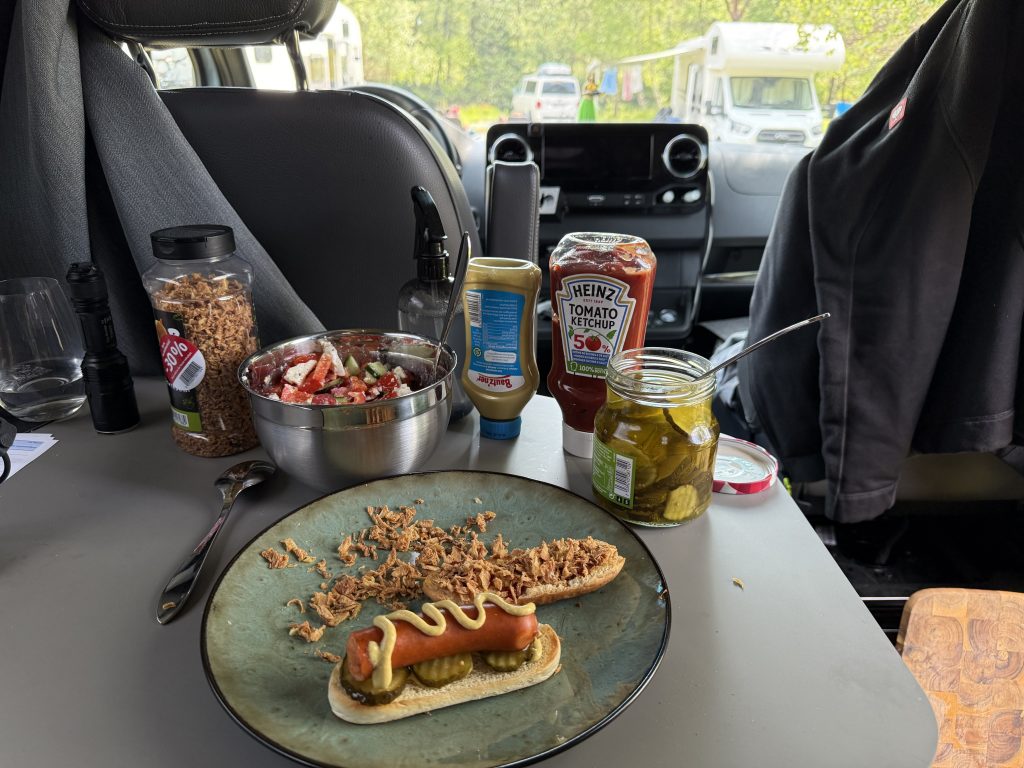 Abendessen war dann das gleiche wie gestern: Würstchen und Brötchen in der Pfanne warmgemacht und dann die Hotdogs gebaut, die zweite Hälfte vom griechischen Salat stand ja schon fertig essbar im Kühlschrank.