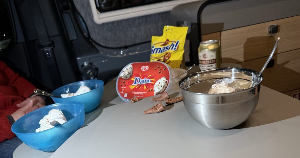 Wieder zurück im Auto gab’s zunächst ein leckeres Daim-Eis. Danach haben wir einige Runden „Tutto“ gespielt und sind dann ins Bett gegangen.