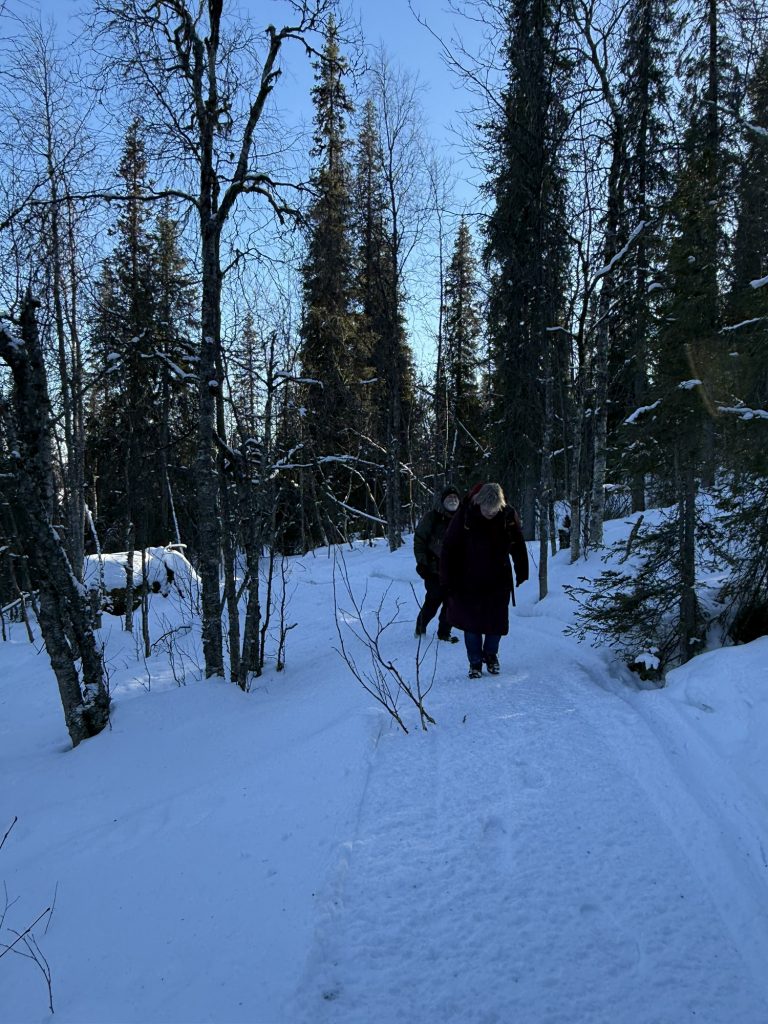 Es ging entlang einer Schneemobilspur, stellenweise recht steil durch den Wald den Berg hinauf.