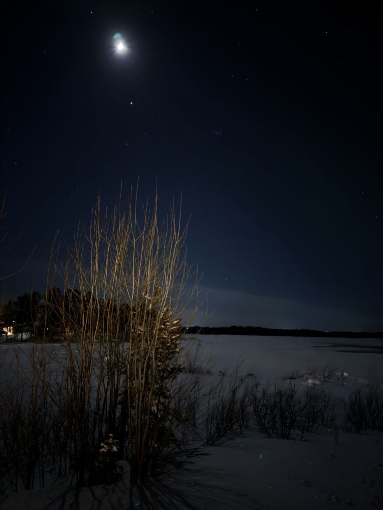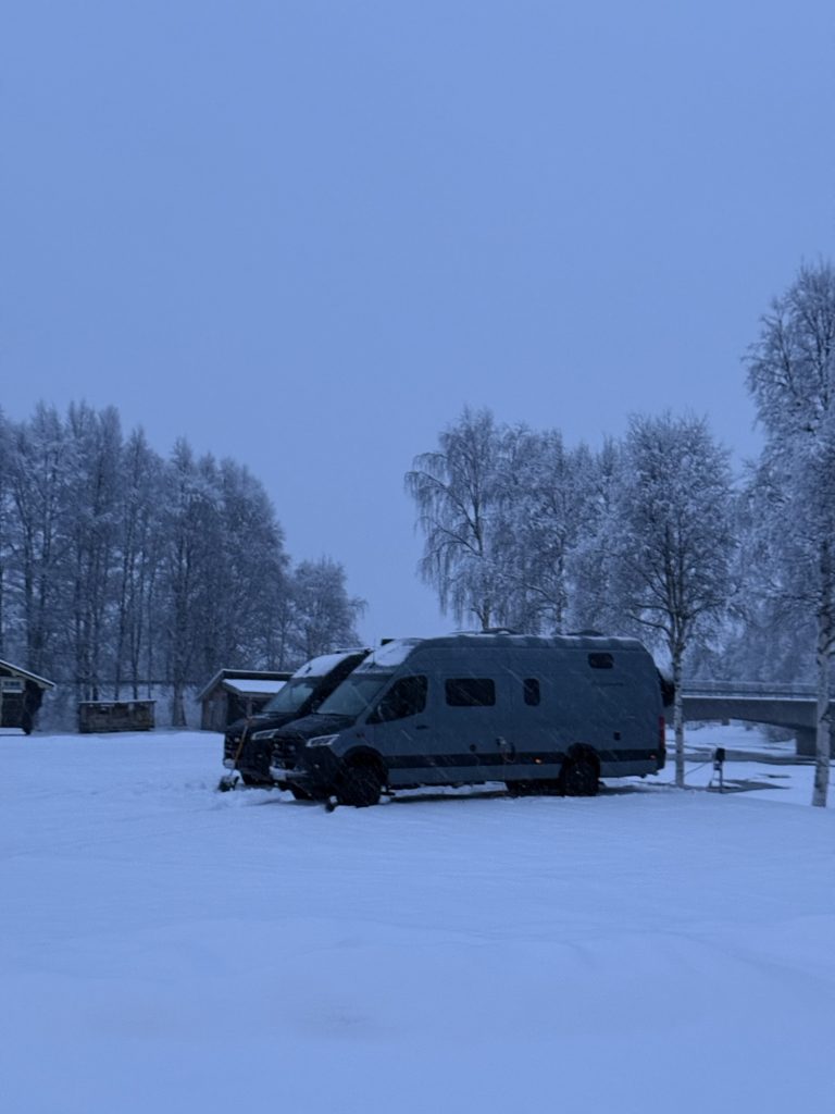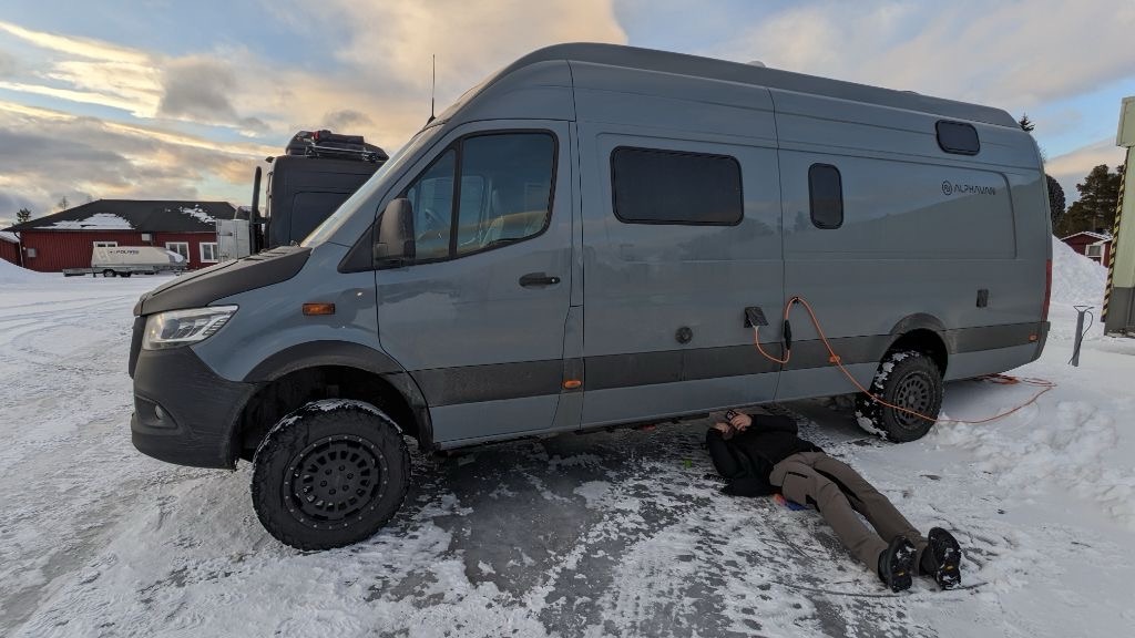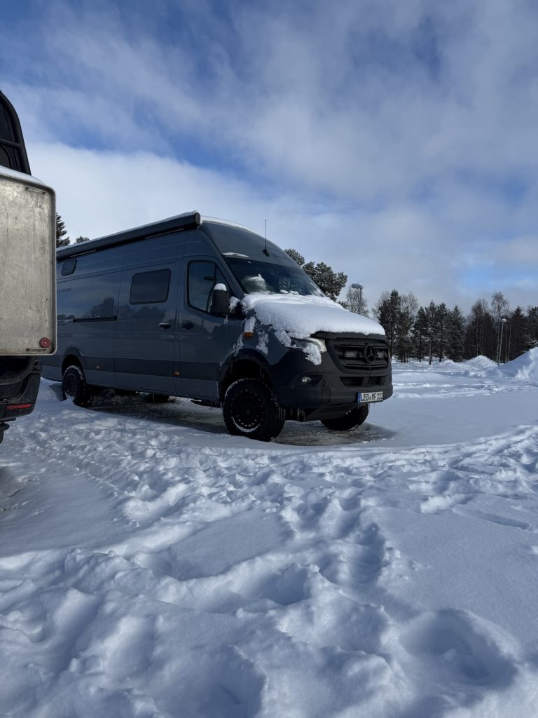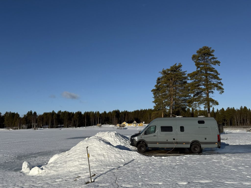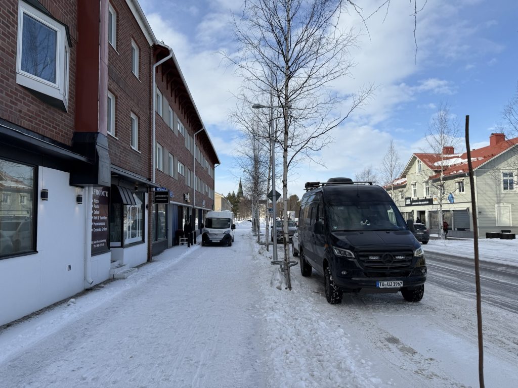 Weiter ging’s nach Arjeplog, wo wir eine gute Stunde vor Sonnenuntergang ankamen. Mein Autole hatte ein kleines Problem mit dem Grauwasserventil, so dass ich ein wenig abdichten musste, was dank der trockenen, dicken Eisplatte, auf der wir standen, ohne allzuviel eingesauter Klamotten ablief.