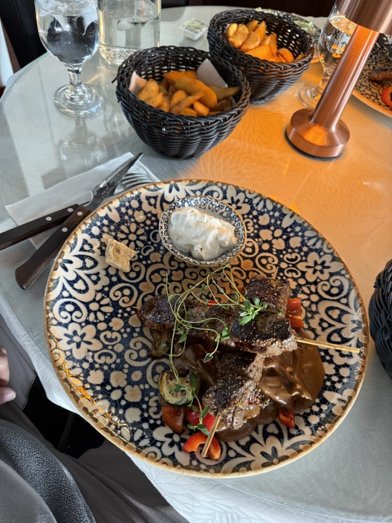 Wir haben alle drei das Gleiche gegessen: Souvlaki von Ren und Elch – lecker!