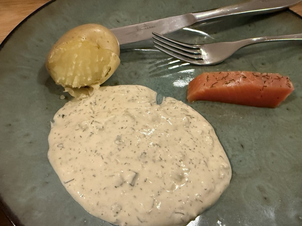 Wieder zurück auf dem Campingplatz kochte Ulf uns Pellkartoffeln und machte eine leckere Remoulade zum Lachs und den Kartoffeln.