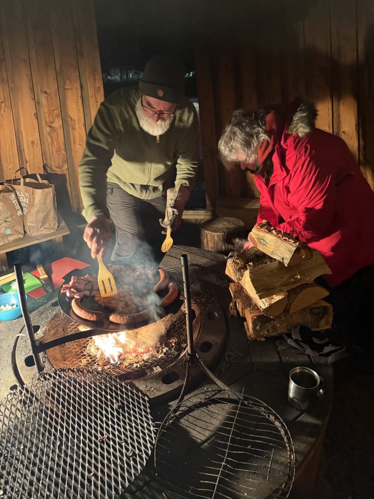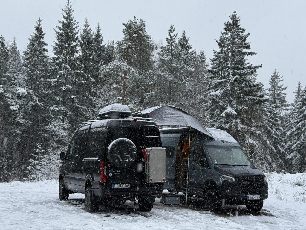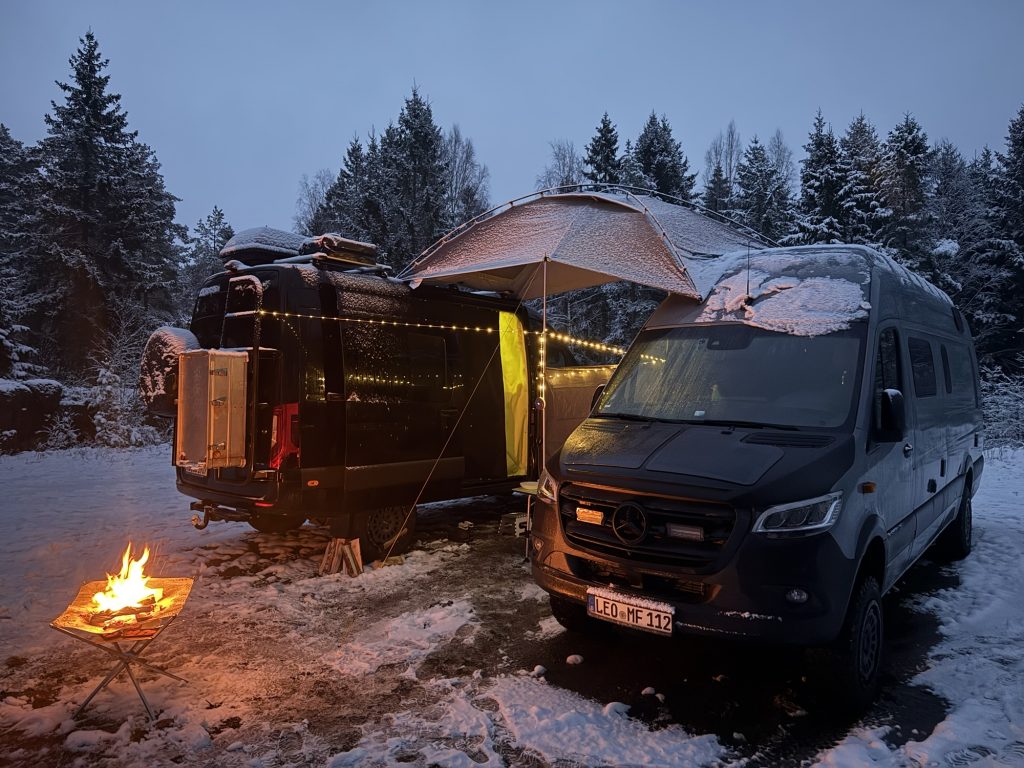 Aufgrund des andauernden Schneefalls und weil wir draußen essen wollten, haben wir auf den Sprintern das „Sonnensegel“ von Ulf befestigt und noch eine Plane als Windschutz angebracht. Die Lichterkette sorgte noch zusätzlich für eine gemütliche Atmosphäre.
