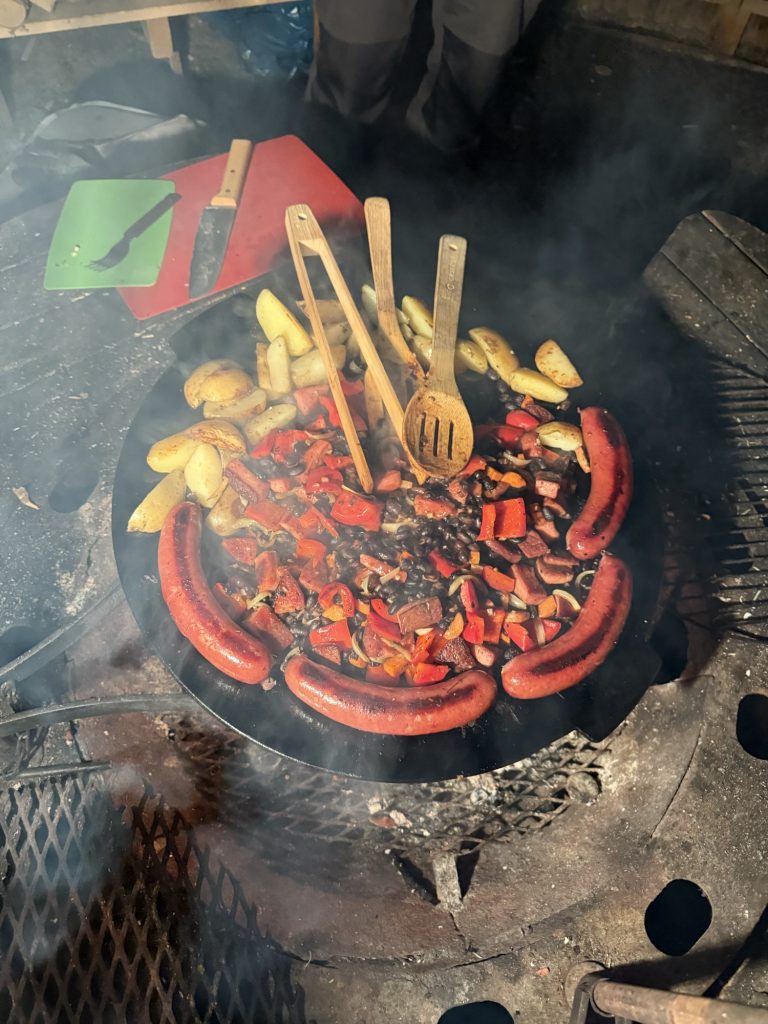 Zurück auf dem Campingplatz haben wir das Feuerchen wieder angefacht und somit die Grillstelle für das Abendessen vorbereitet: Rentierbratwurst, ein bisschen Falun-Wurst, schwarze Bohnen, Paprika, Karotten, Zwiebeln, Kartoffeln und vieeeele Gewürze. Lecker!