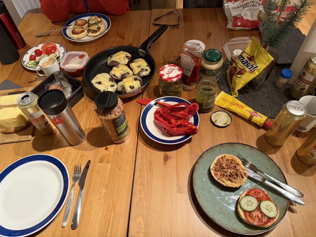 Ulf hat uns mit dem Rentierhack aus Arvidsjaur Klasse Burger-Patties gebraten, so dass wir uns sehr lecker und seeehr satt gegessen haben.