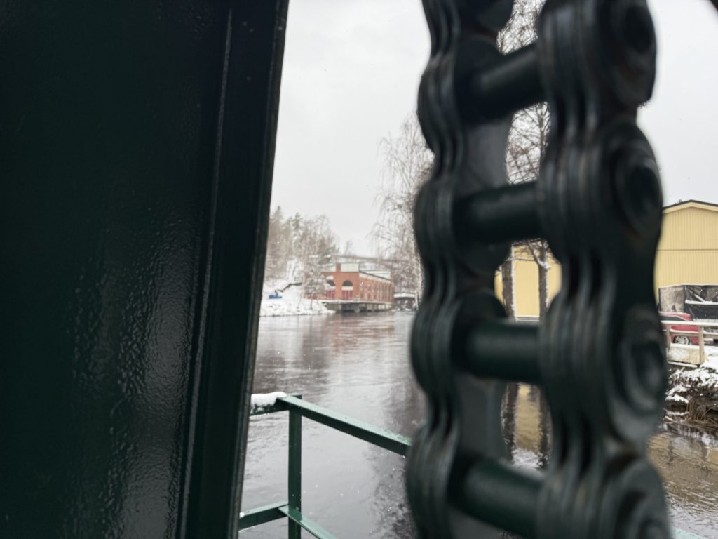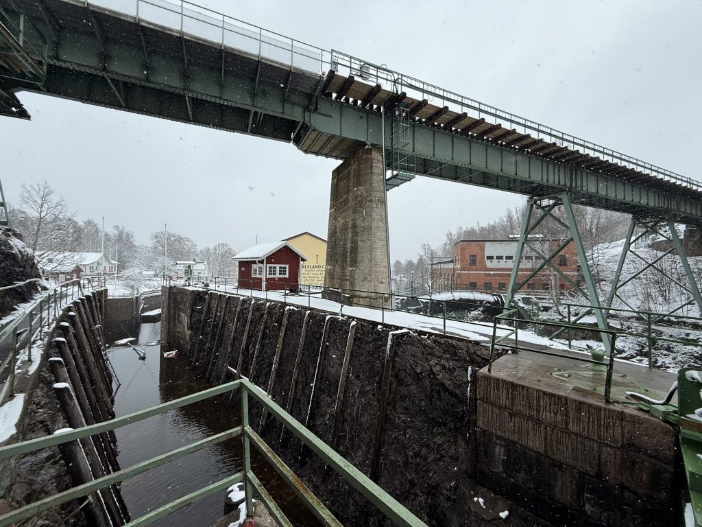 Das alte Kraftwerk in Håverud durch die ehemalige Straßen-Klappbrücke gesehen