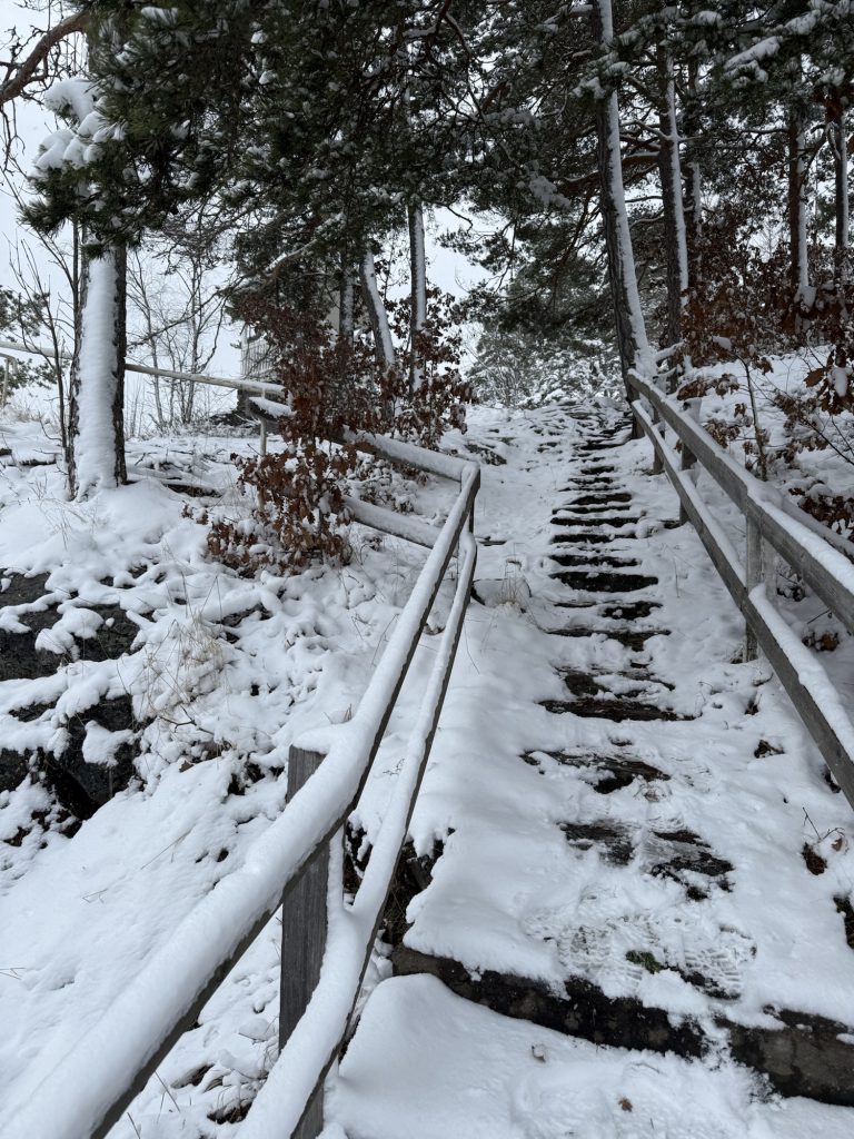 Wir haben am Kanal noch einen kleinen Spaziergang zu einem Aussichtspavillon auf den Kanal gemacht. Achtung: Rutschgefahr durch frischen Schnee auf bemoosten Felsen! Ist aber alles gut gegangen.