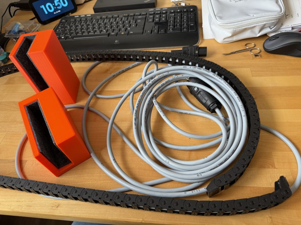 Morgens noch schnell zwei Maschinen Wäsche bei Mama gewaschen, die Halter für das Schneidebrett gefilzt und das Kabel für die Ecoflow in die Schleppkette eingezogen – dann kann ich endlich auch die Kühlbox betreiben.