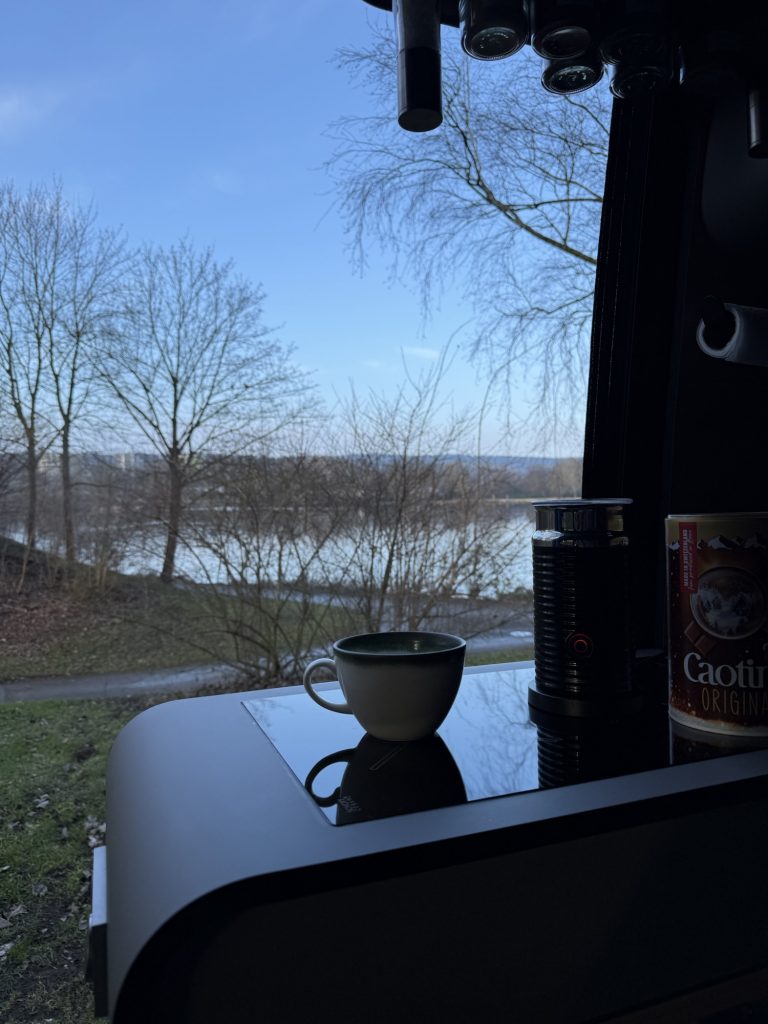 Doch zuerst gab’s einen heißen Kakao bei Sonnenschein und blauem Himmel.