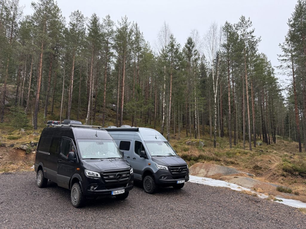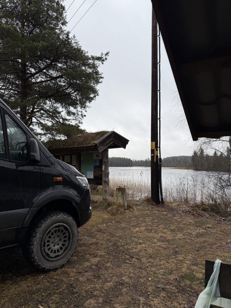 Weiter ging’s durch den Tiveden auf Schotterpiste bis zu unserem Schlafplatz am Mellre Fisklösen. Die letzten paar hundert Meter waren recht spannend zu fahren: aufgrund der frühlingshaften Temperaturen ist der Boden aufgetaut und mächtig aufgeweicht und die Reifen finden keinen rechten Grip.