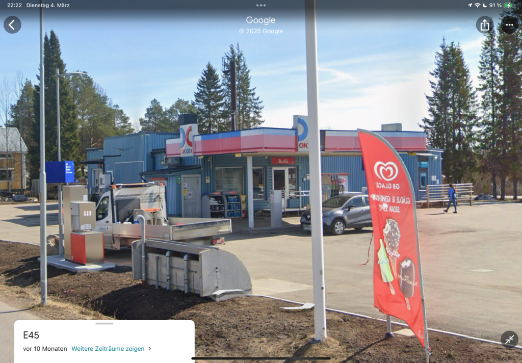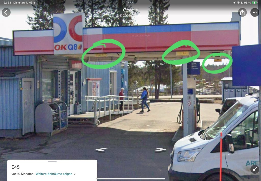 Die etwas in die Jahre gekommene OKQ8 Tankstelle hatte „wahnsinnig auffällige“ Hinweise über die mögliche Einfahrtshöhe von 3 m. Ich hatte Glück und bin von außen angefahren und stand im Wesentlichen außerhalb der Überdachung.