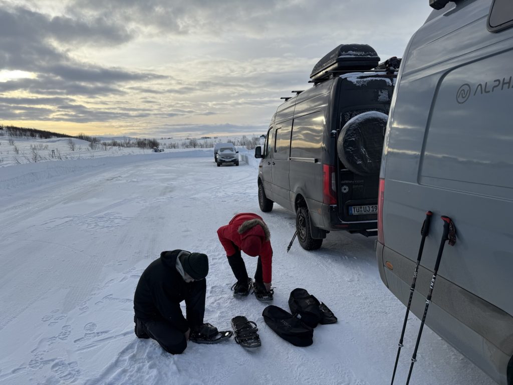 Morgens begrüßt uns gutes Wetter – also packen wir die Schneeschuhe aus und laufen eine kleine Runde vom Parkplatz aus.
