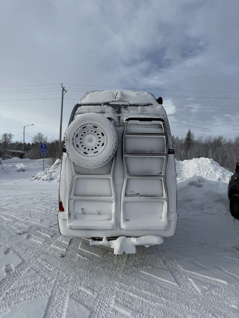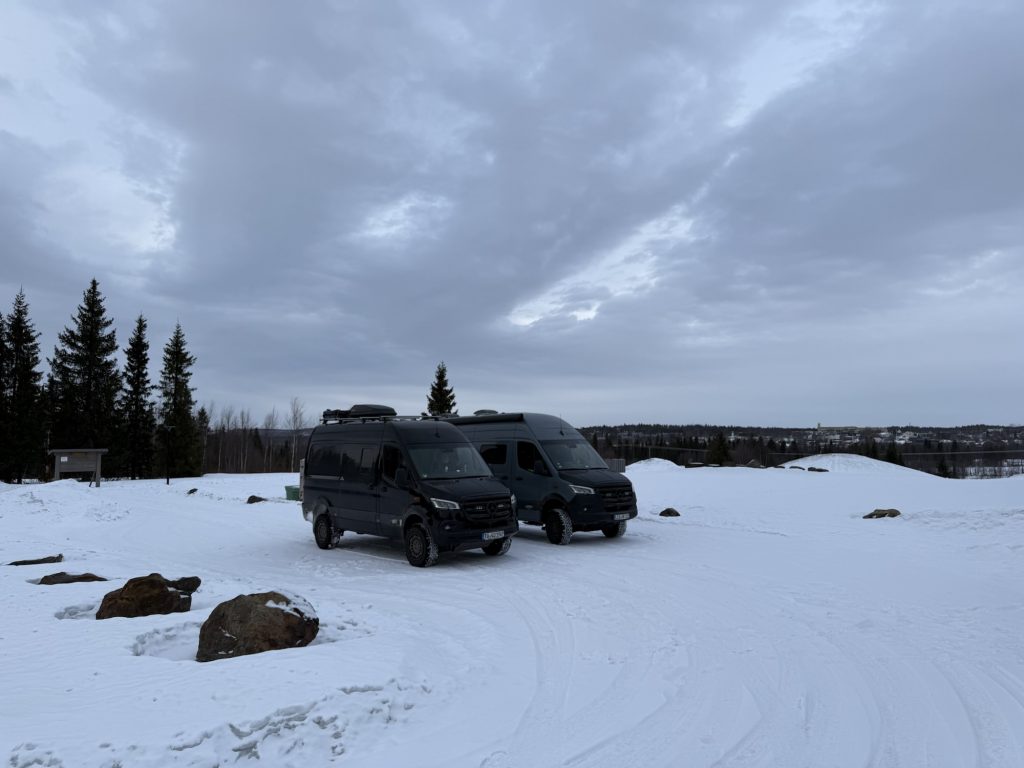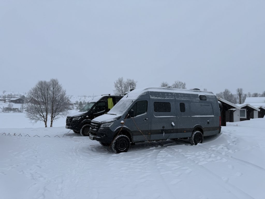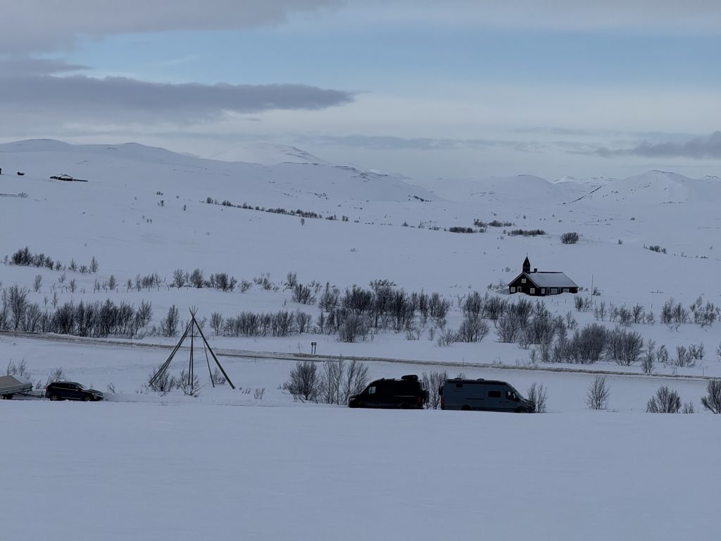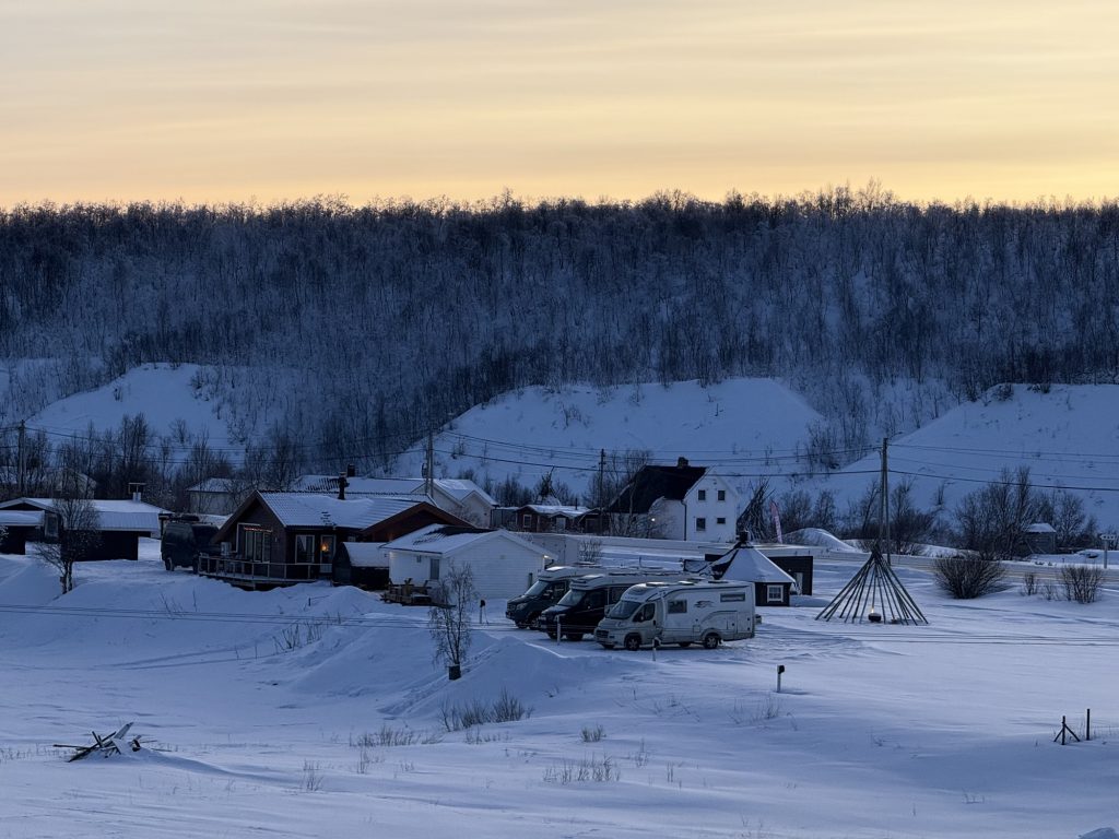 Hier stehen wir gut – ein paar Meter abseits der E45. Die Straße ist nicht zu hören von hier – aber der Schneepflug, der gefühlt alle 15 Minuten vorbeikommt.