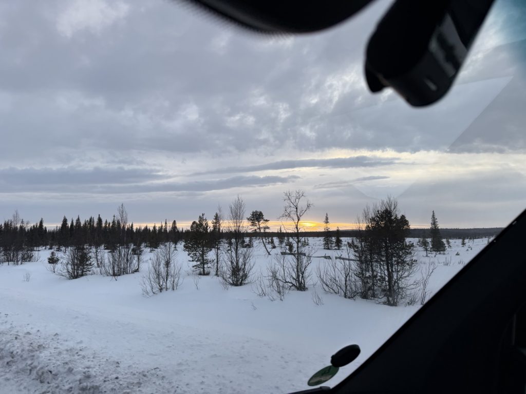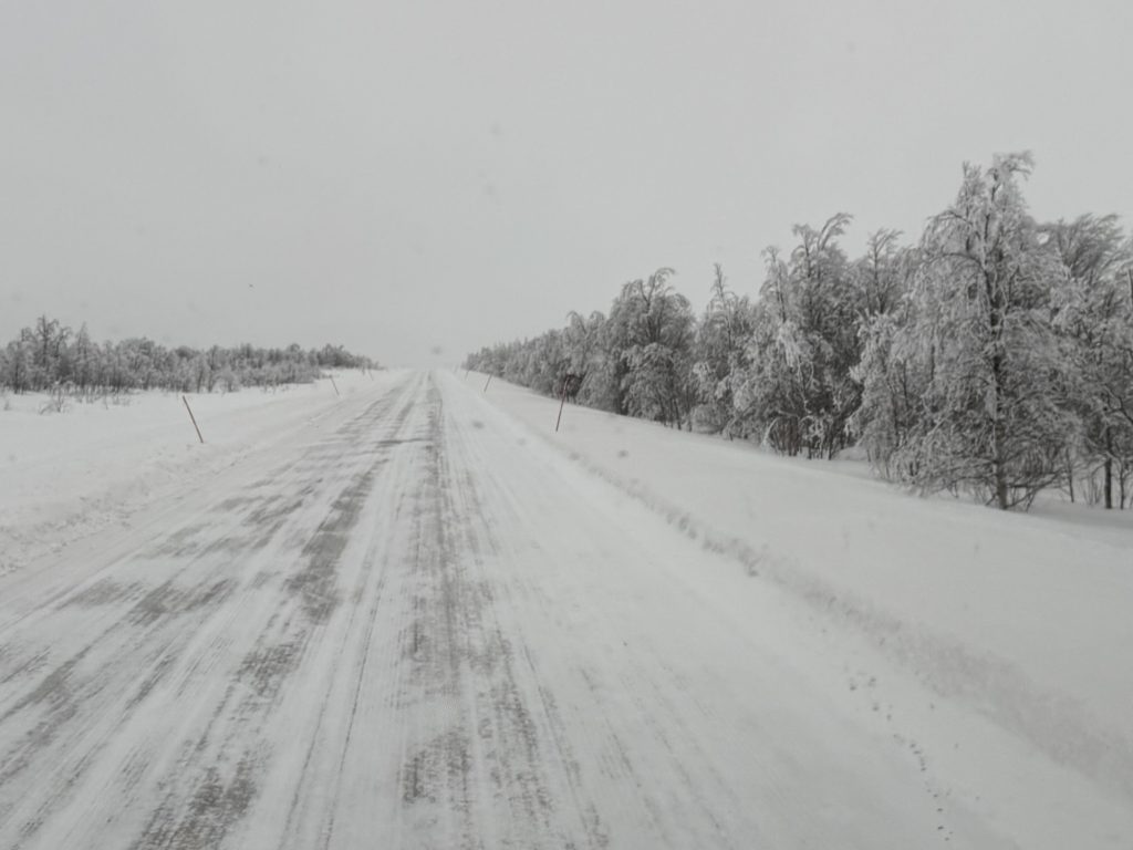 Gut so: um kurz nach 08:00 finnischer Zeit waren wir unterwegs in einer tristen Winterlandschaft in der Nähe der finnisch-/norwegischen Grenze.