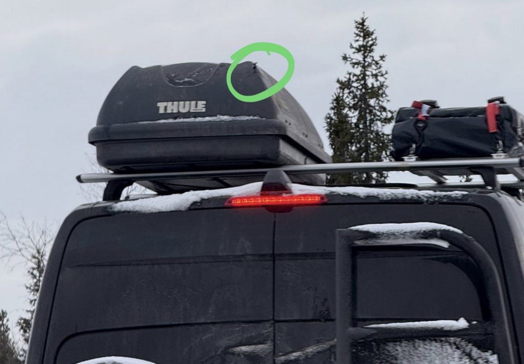 Gesagt, getan: der Sprinter senkte sich ausreichend ab, um ohne weitere Betührung auszufahren. Leider haben wir dann gesehen, dass ein ordentliches Loch in der Dachbox zurückgeblieben ist – was sich aber mit Bordmitteln zumindest notdürftig verschließen lässt.